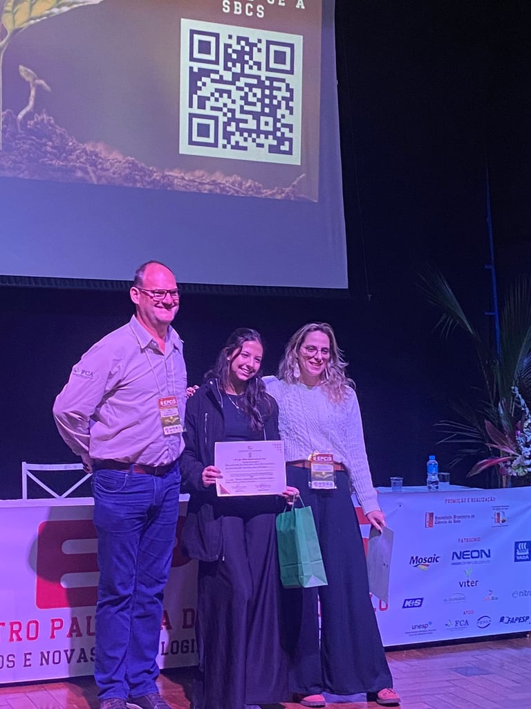 Poster presentation by Maria Eduarda Santana, undergraduate member, entitled "Potential of Crop-Livestock Integration in the formation of biogenic aggregates and increase of carbon in sandy soils", winner of the award for Best Oral Presentation.