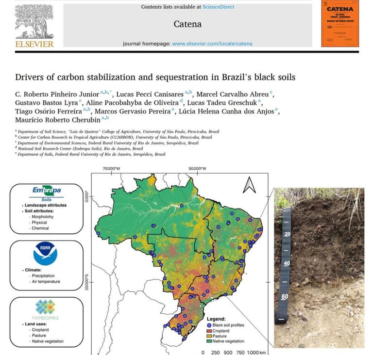 Black soils (i.e., Chernosols) are soils characterized by moderate to high accumulation of organic matter and high natural fertility, being particularly important in mitigating climate change and food security, but are considered by the Food and Agriculture Organization of the United Nations (FAO) as soils highly vulnerable to degradation. In view of this, the study “Drivers of carbon stabilization and sequestration in Brazil’s black soils” was published in the Catena journal, conducted by the team from CCARBON/USP - Center for Carbon Research in Tropical Agriculture and led by SOHMA postdoctoral fellow Carlos Roberto Pinheiro Junior.