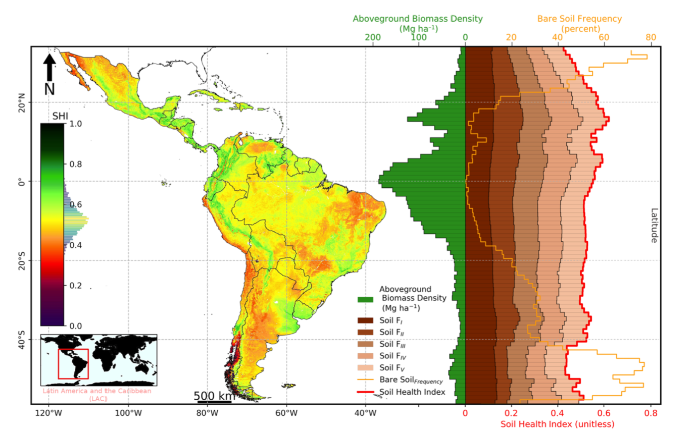 Mapa do índice de saúde do solo para a América Latina e Caribe. O lado direito mostra tendências latitudinais por grau nas funções do solo, frequência de solo exposto 26 e biomassa aérea 41 na ALC. Funções do solo: FI – Armazenar, regular fluxos e disponibilidade de elementos químicos; FII – Regular fluxos de água, armazenamento e disponibilidade de água; FIII – Sequestrar carbono orgânico do solo e apoiar a biodiversidade do solo; FIV – Suporte físico para o crescimento das plantas; FV – Resistência à degradação por erosão.