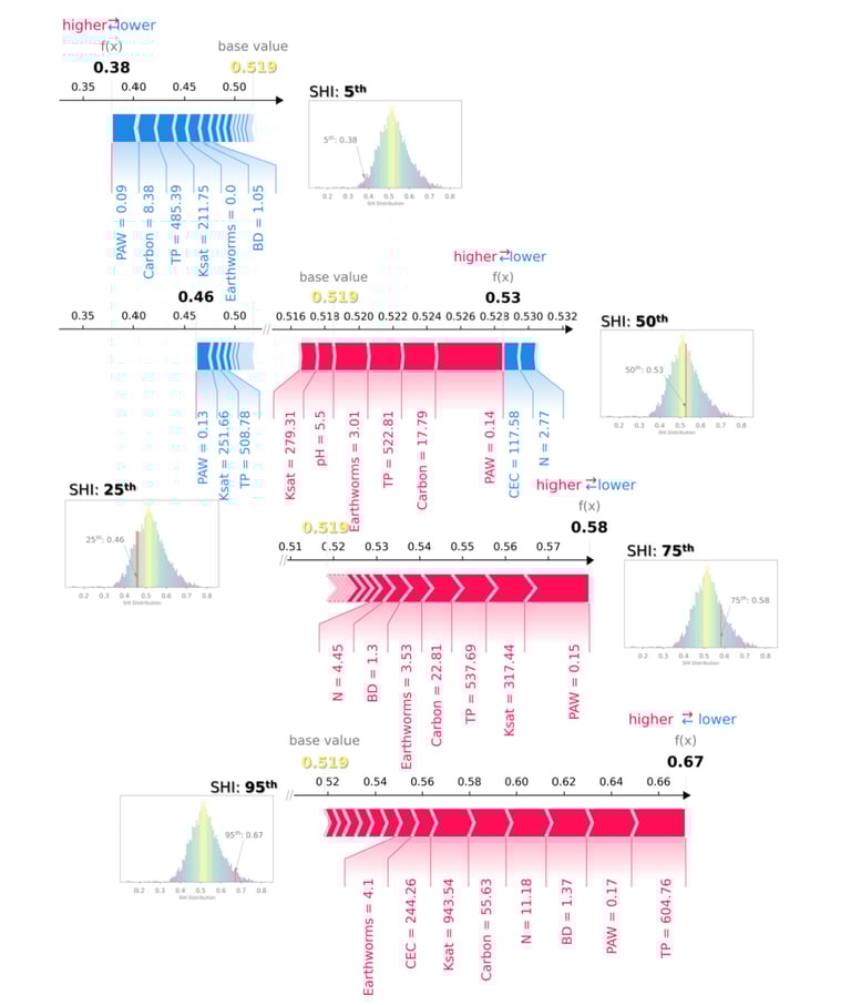 Os gráficos de força ilustram o impacto combinado de cada indicador do solo nos valores do SHI, com efeitos positivos representados em vermelho e implicações negativas em azul. Esses indicadores "competem" entre si, resultando em variações nos valores do SHI (agrupados em percentis) em relação ao valor base esperado do SHI, que é a previsão média para todo o conjunto de dados (0,519 nesta análise).