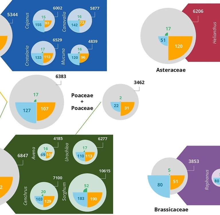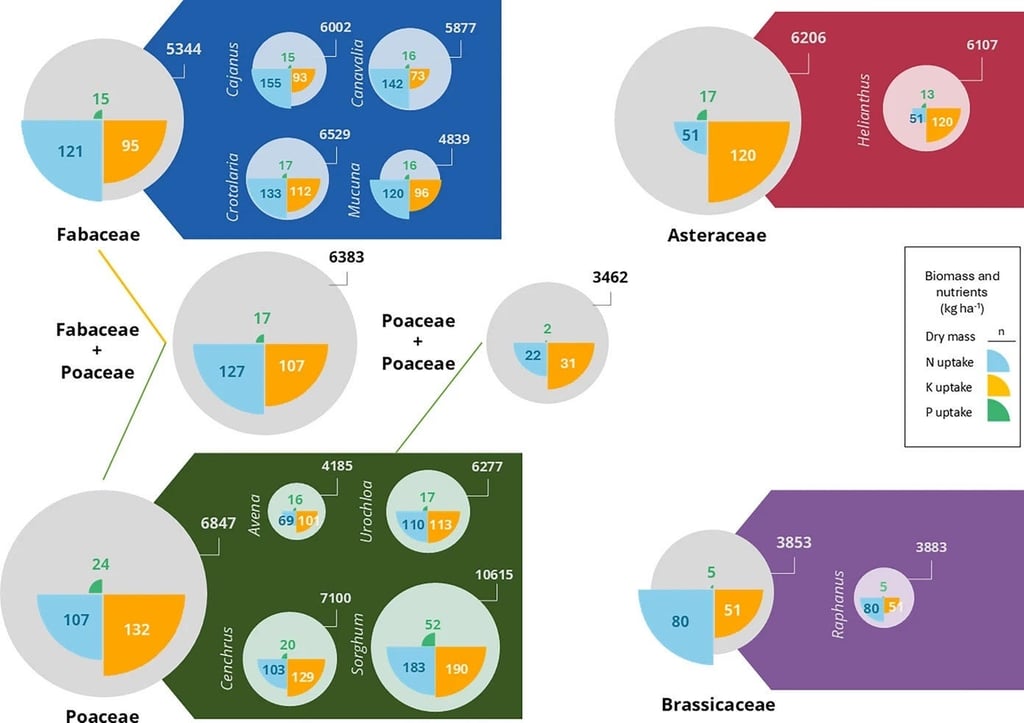 Figura 1. Valores médios e número de observações para a matéria seca e a absorção de nutrientes (nitrogênio-N, fósforo-P e potássio-K) de plantas de cobertura das quatro principais famílias botânicas e dos principais gêneros em estudos selecionados. Os valores fora dos círculos indicam a produção média de matéria seca (kg ha⁻¹), enquanto os valores dentro dos quartos de círculo correspondem à absorção média de nutrientes (kg ha⁻¹). Os diagramas centrais indicam os valores das duas misturas mais estudadas.