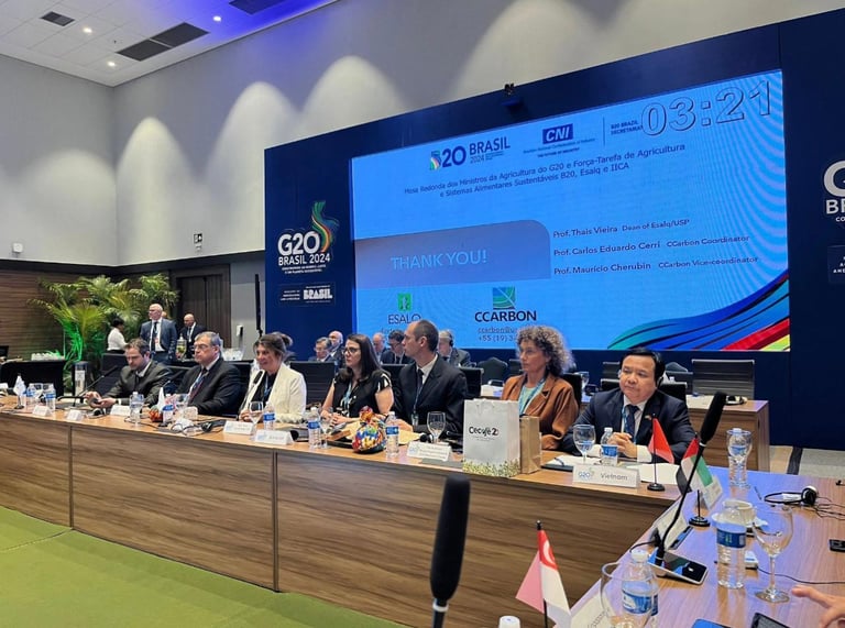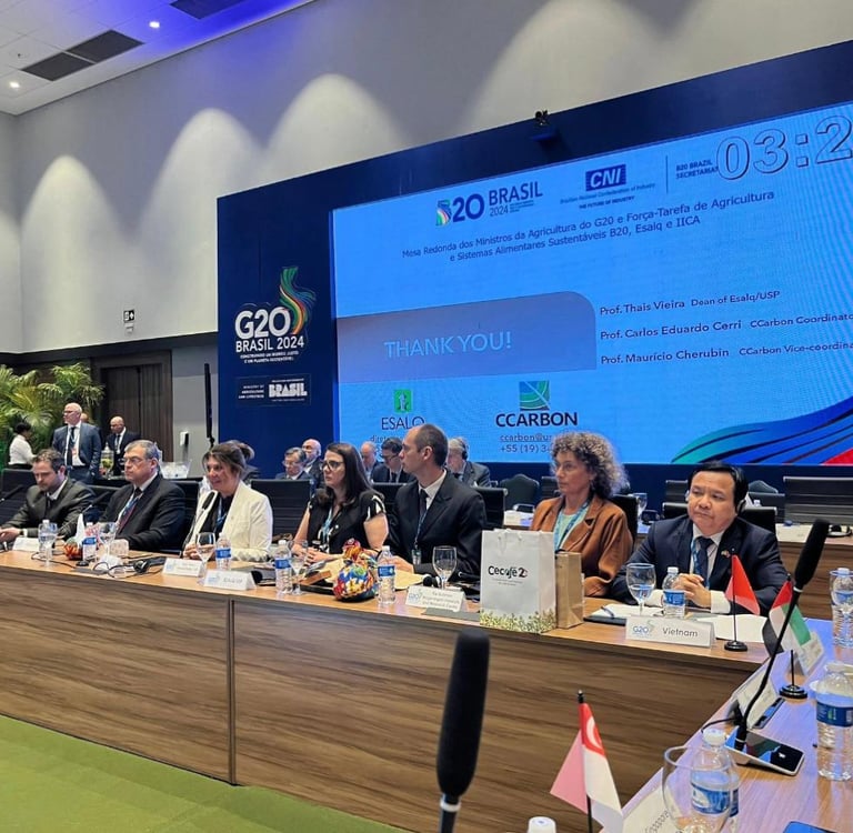 No dia 9 de setembro de 2024, ocorreu o Fórum Internacional de Agricultura e Pecuária (FIAP), evento paralelo ao G20, em Cuiabá, MT. O evento teve participação do Prof. Dr. Maurício Roberto Cherubin, juntamente com o Prof. Dr. Carlos Eduardo Cerri (Diretor do CCARBON/USP), Profa. Dra. Aline Cesar, Prof. Dr. Pedro Brancalion e Profa. Dra. Thais Vieira (Diretora da ESALQ/USP). Eles dissertaram sobre o avanço na produção de alimentos e no uso de práticas de manejo mais sustentáveis (como plantio direto e sistemas integrados).